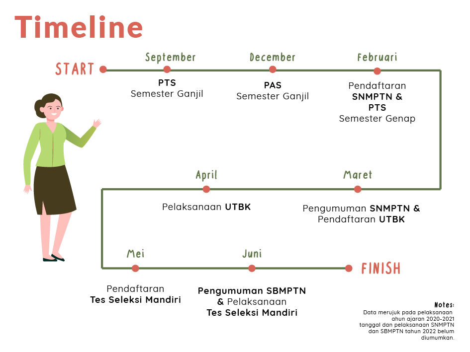 Yang ketiga adalah Tes Seleksi Mandiri. Kalau ini adalah tes ujian masuk PTN melalui jalur mandiri. Setiap PTN memiliki tes dan jadwalnya masing-masing, sehingga kalian harus sering-sering mencari informasi nya ya.